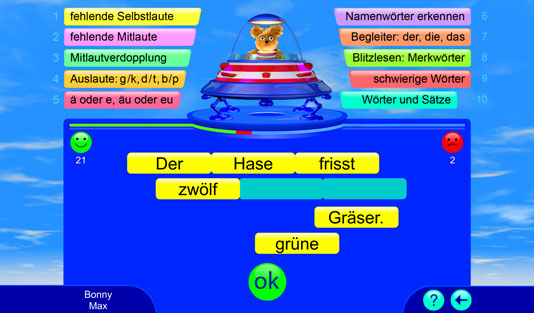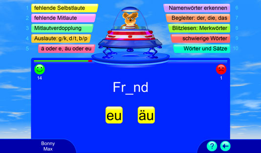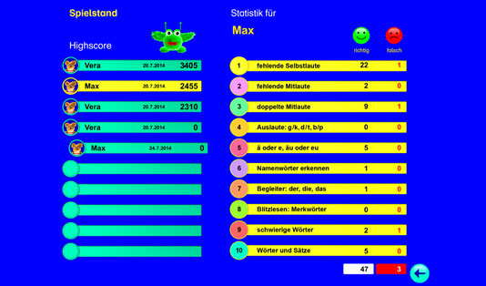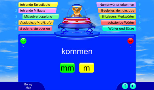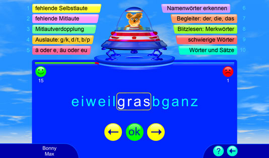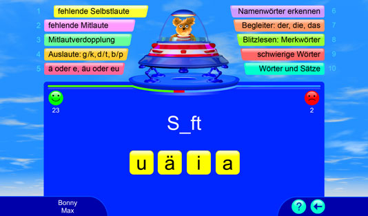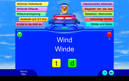 Dieses Lernspiel bietet über 2.000 deutsche Übungswörter für ein systematisches Rechtschreib- und Wortschatztraining. Alle Wörter werden vorgelesen. Die Spieler bekommen eine sofortige Rückmeldung, ob die Aufgabe richtig oder falsch gelöst wurde. Bei einem Fehler wird die richtige Lösung automatisch gezeigt; so können wiederkehrende Muster und Regelungen entdeckt und angewendet werden. Falsch gelöste Aufgaben werden nach dem „Karteikartenprinzip“ wiederholt. Hier wird spielend die deutsche Rechtschreibung gelernt.