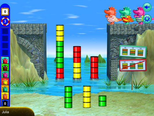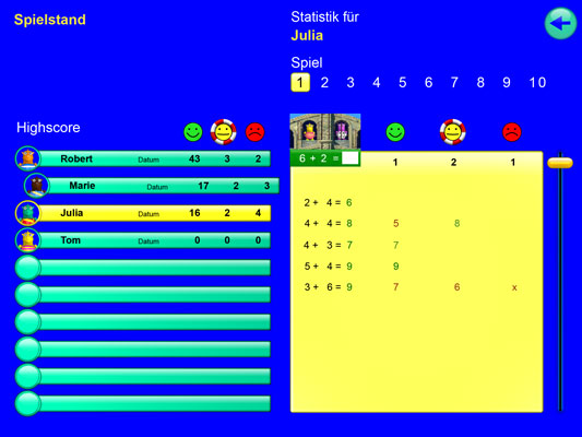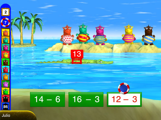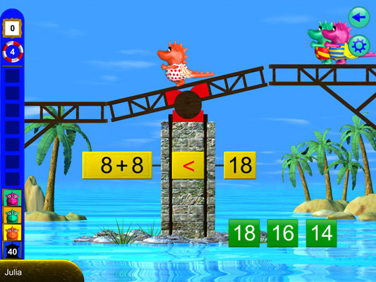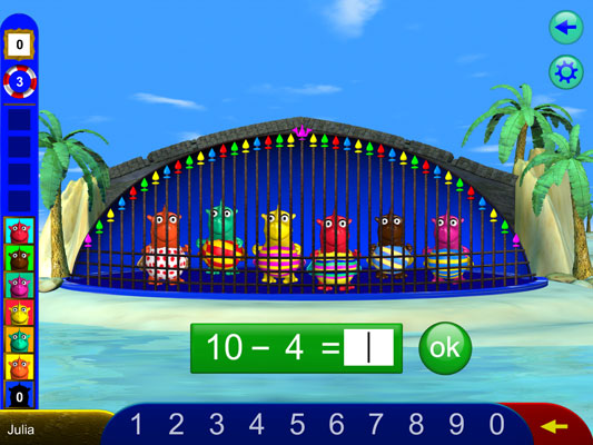 Additions- und Subtraktionsaufgaben bis 20 mit und ohne Zehnerübergang • Summen und Differenzen ausrechnen • Gleichungen richtig ergänzen • passende Rechenzeichen in eine Gleichung einsetzen • Gleichungen mit wechselnden Platzhaltern lösen • zu Ergebnissen die passenden Aufgaben finden • Addieren von 3 Zahlen • Zahlzerlegungen von 10 • größer, kleiner, gleich unterscheiden und die entsprechenden Rechenzeichen > = < erkennen • 2. Chance mit Lösungsweg durch Rettungsring-Hilfe • mit ausführlicher Fehlerstatistik für alle Spieler • Motivierender Highscore und Urkunden-Sammelalbu
