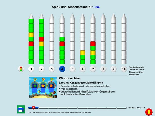 Ein Spieldurchgang besteht aus 10 Spielen, die insgesamt ca. 1,5 Stunden dauern. Zwischen den Übungen kann jederzeit gewechselt, das gesamte Spiel kann jederzeit unterbrochen und an derselben Stelle fortgesetzt werden (der Spielstand wird gespeichert). Die Spieldauer ist auf das Vorschulalter abgestimmt, so dass das Kind die Übungen in einem überschaubaren Zeitraum bewältigen kann und ein Erfolgserlebnis hat.